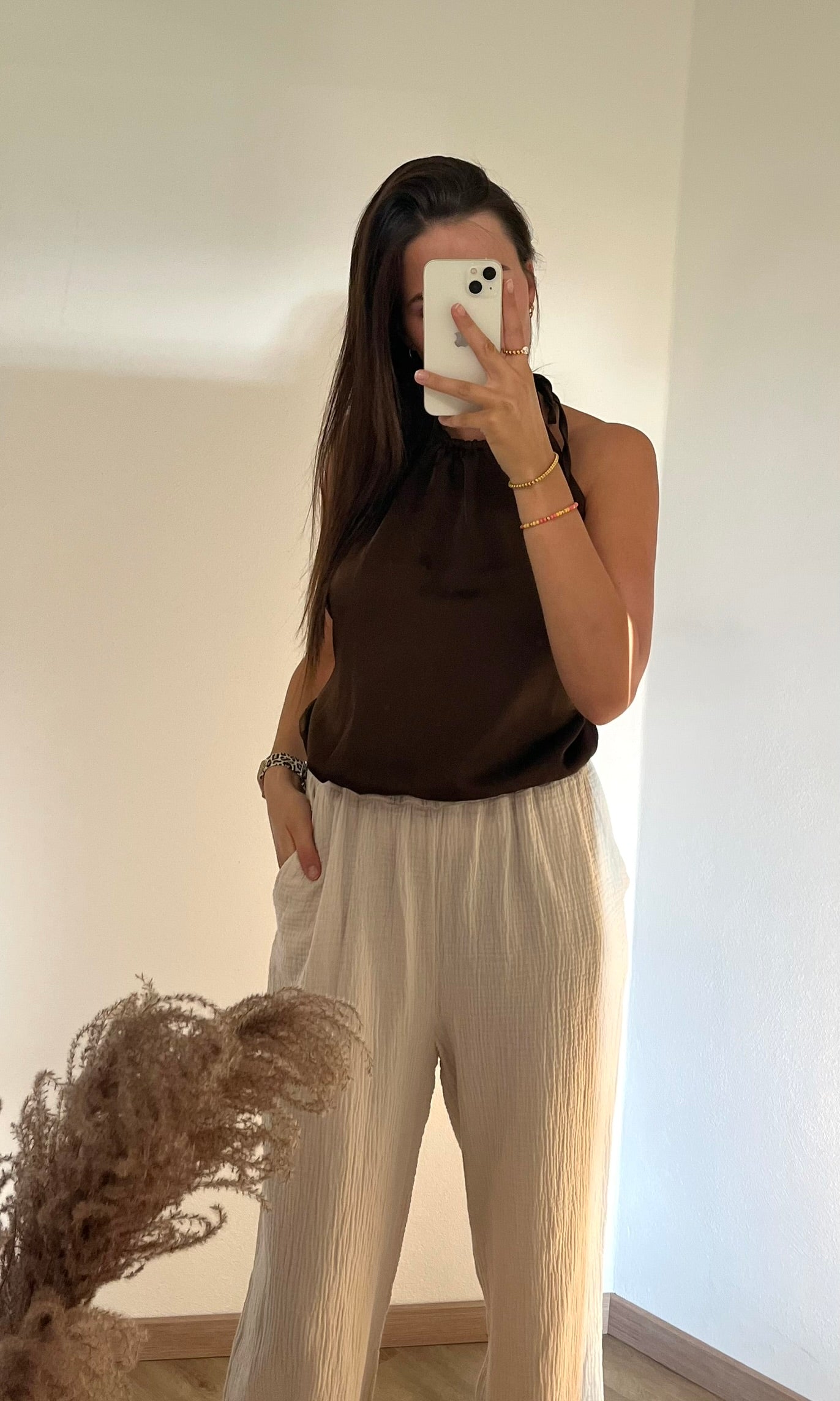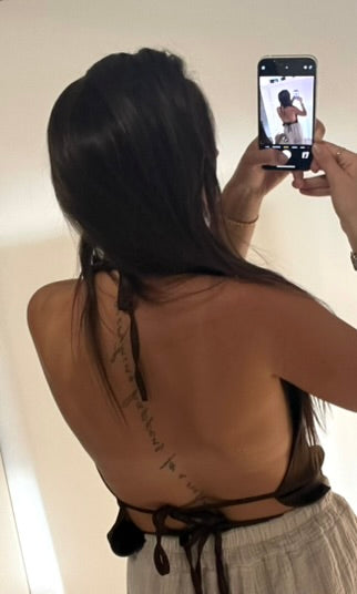 Dieses stylische Satintop „Alia“ besticht durch seinen rückenfreien Schnitt und die elegante braune Farbe.